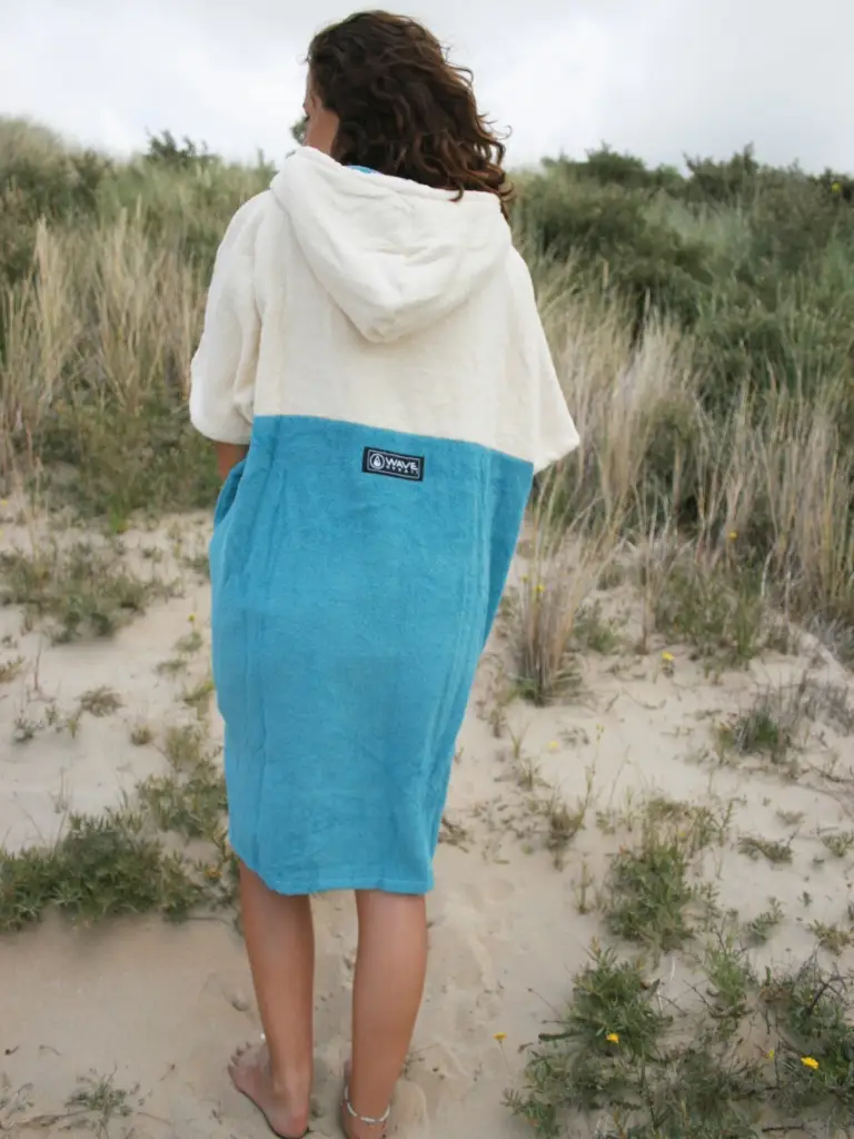 Femeie care poarta un poncho plaja dama colorat, pentru plaja, scuba sau surfing, culoare alb-crem, albastru, cu buzunare negre
