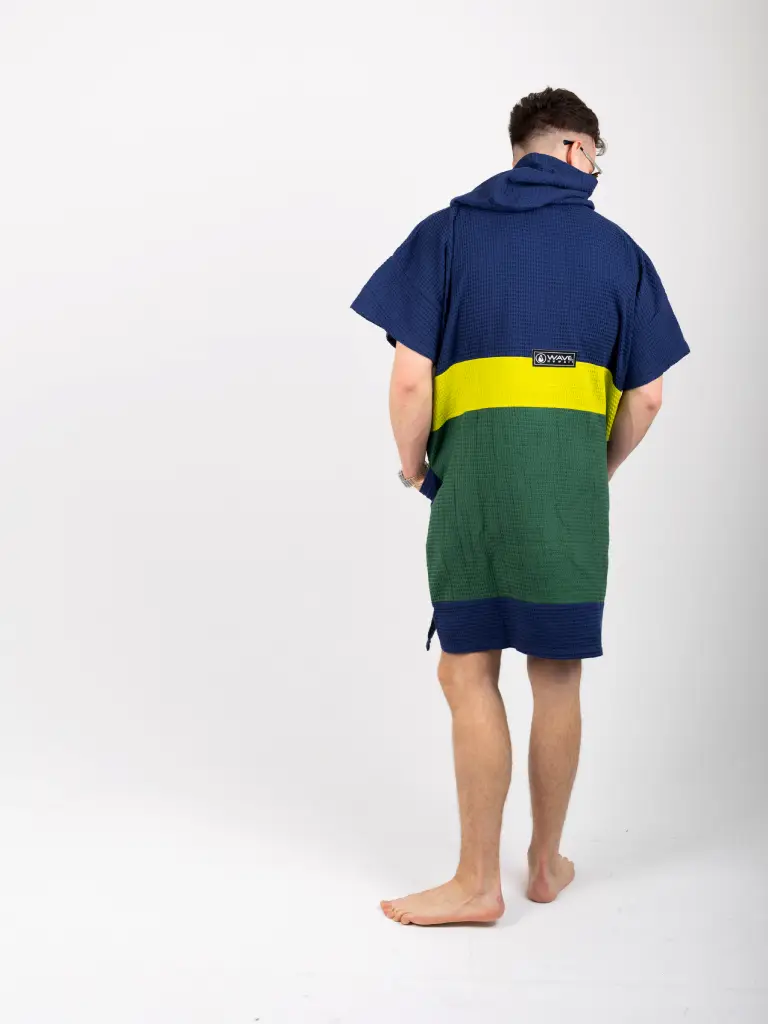 Barbat care poarta pe plaja un poncho barbati din bumbac, culoare albastru, verde inchis, verde lime